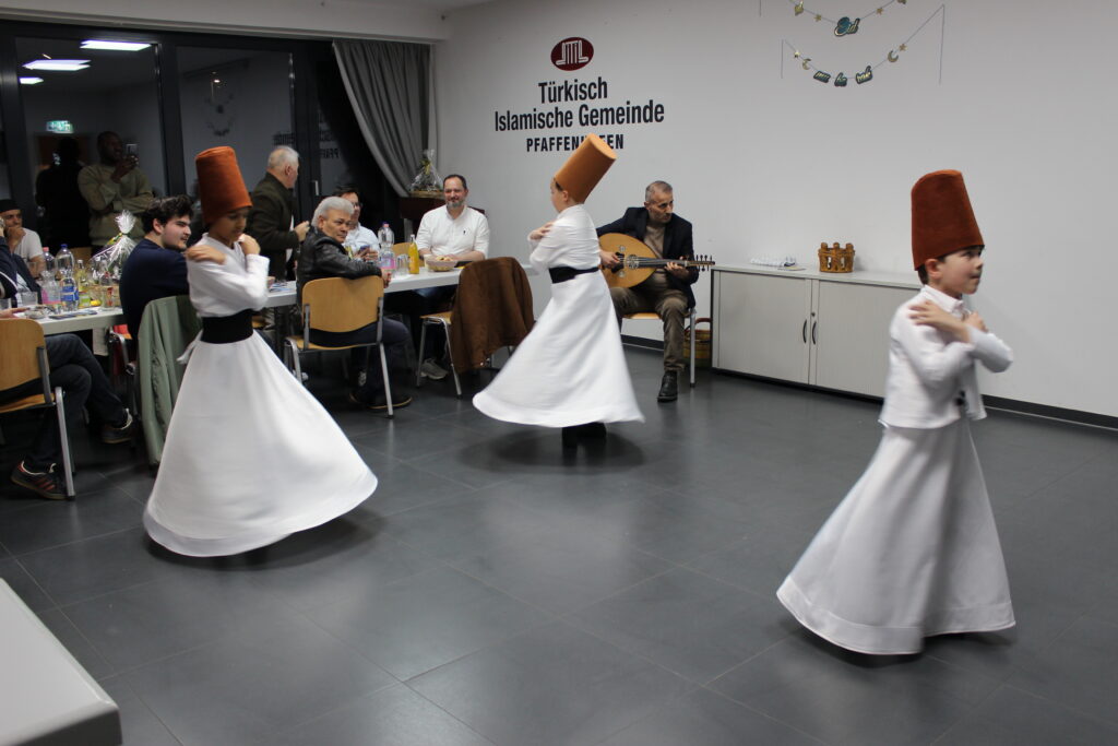 Diese Gemeinschaft im Ramadan bezeichnete die Islamwissenschaftlerin Susanne Odin als wirklich beneidenswert. Als Mitarbeiterin für Interreligiösen Dialog im Kirchenamt der evangelisch-lutherischen Landeskirche Bayern nimmt sie in verschiedenen Gemeinden am Fastenbrechen teil, und dabei spürt sie immer wieder „die Freude am Ramadan, an der Gastfreundschaft und der Gemeinschaft“. Für einen besonderen „Hingucker“ sorgten an diesem Abend drei Buben, die als „junge Derwische“ auftraten: Sefa, Ömer und Berat traten in weißen Gewändern und hohen Hüten auf und tanzten und drehten sich minutenlang zur Musik von Imam Coskun Öztürk.
